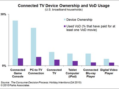 Connected devices include web-enabled game consoles, Blu-ray Disc players, tablet computers including the iPad, and digital video players including Roku and Apple TV. By the end of 2010, more than 40 million U.S. consumers will have a broadband-connected game console, more than eight million will have a PC-to-TV connection, more than five million will have a connected Blu-ray player, and more than four million will have a networked digital video player, Parks predicts.