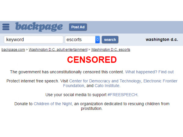 On pages formerly devoted to adult advertisements, Backpage on Monday inserted a banner decrying government censorship: “The government has unconstitutionally censored this content.” The banner encouraged users to “protect internet free speech” and included links to the Center for Democracy and Technology, the Electronic Frontier Foundation, the Cato Institute and Children of the Night, an organization that rescues children from prostitution.