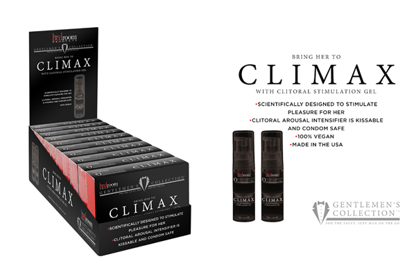 CLIMAX contains a set of four .169 oz. travel-friendly bottles. The four-pack set, merchandised in a sleek box, is also sold as a component to the Bedroom Products Gentlemen’s Collection point-of-purchase display.