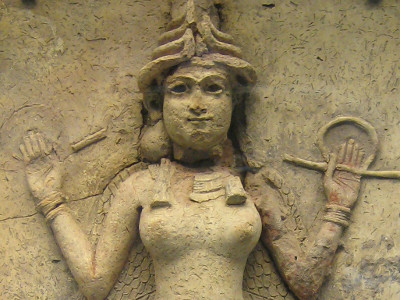 Image: Queen of the Night, thought to be a representation of Ishtar, Babylonian goddess of fertility, love, war and sex. Baked clay relief panel in the British Museum.
