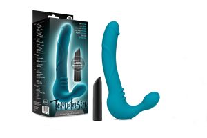 The Temptasia Luna Strapless Strap-On Vibrating Silicone Dildo is elegantly curved with a delicately rounded bulb and a gently textured shaft. Luna’s satiny teal body measures 9 inches (6.75 inches insertable) x 1.35 inches.