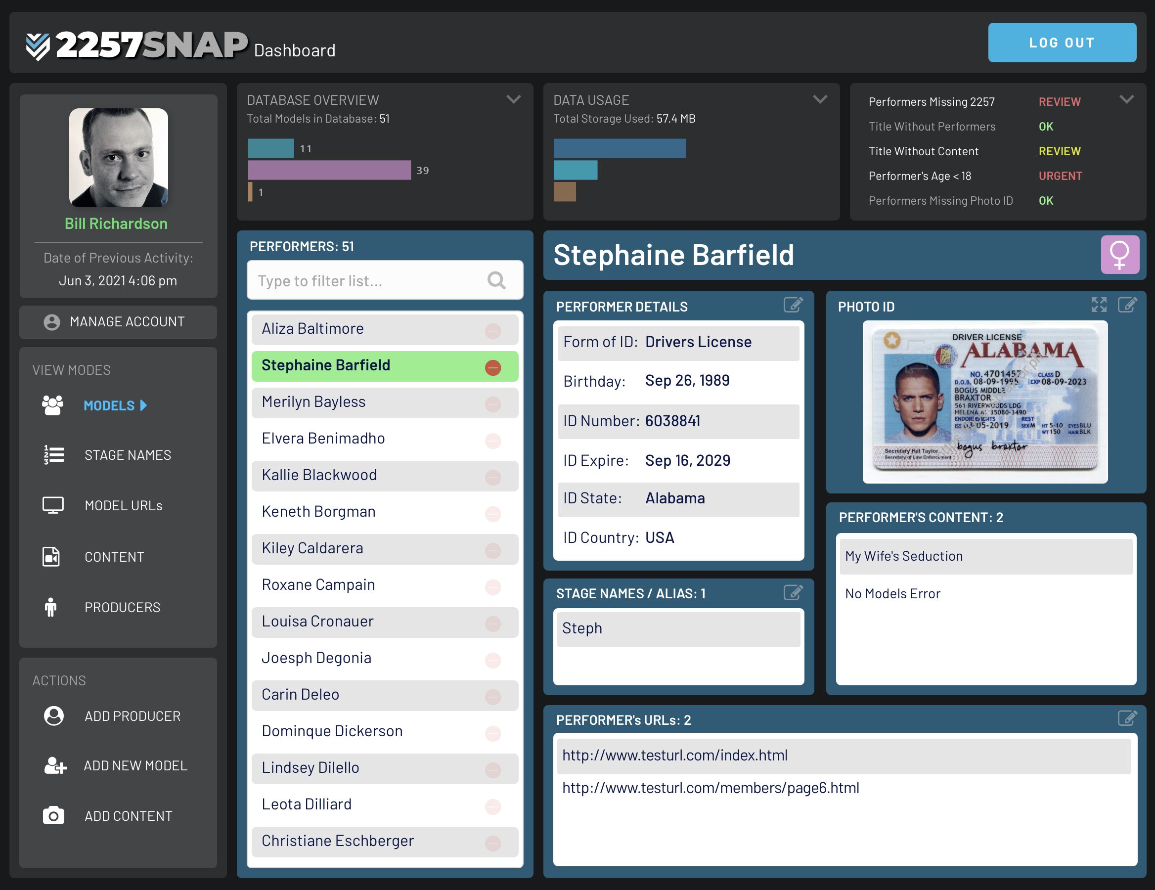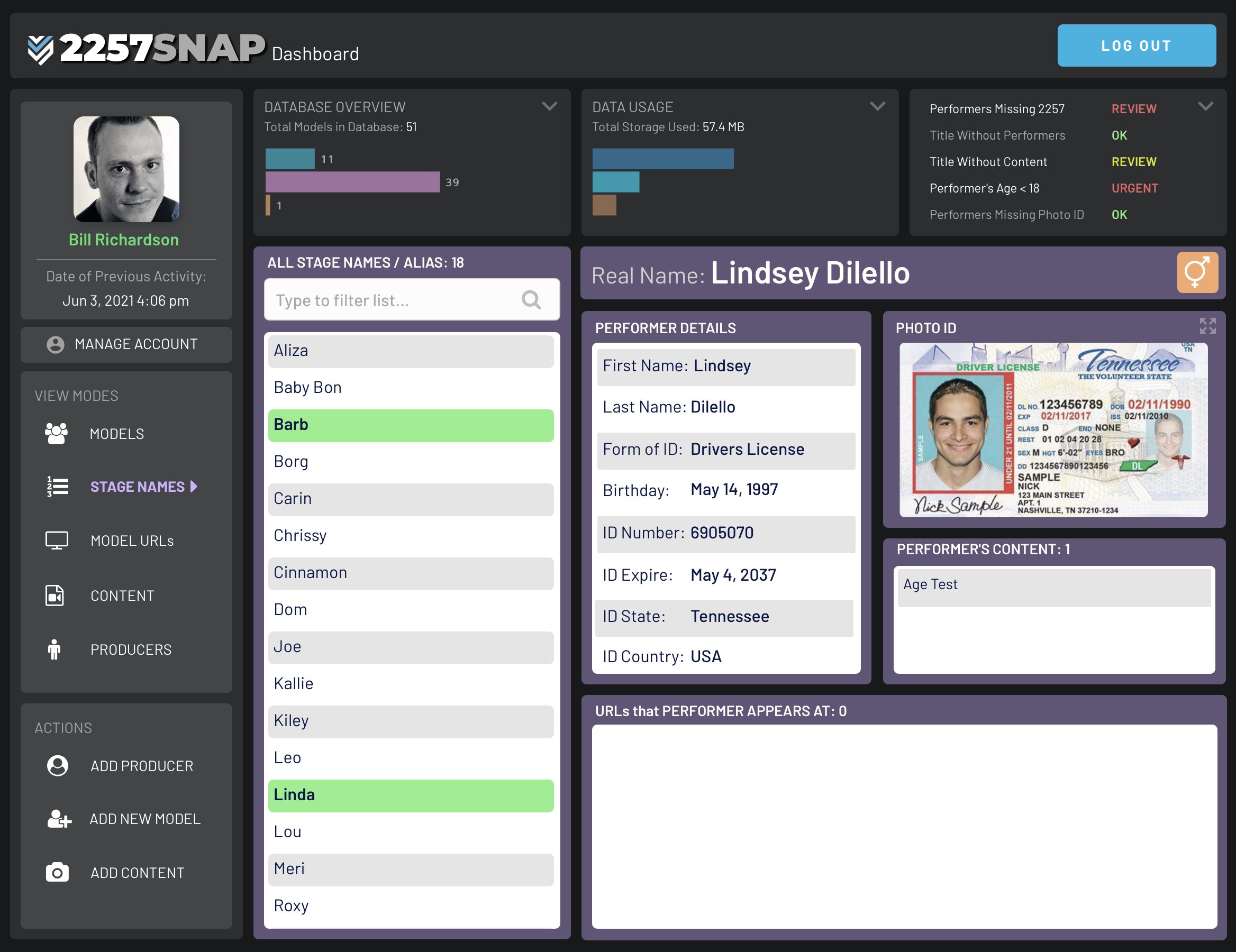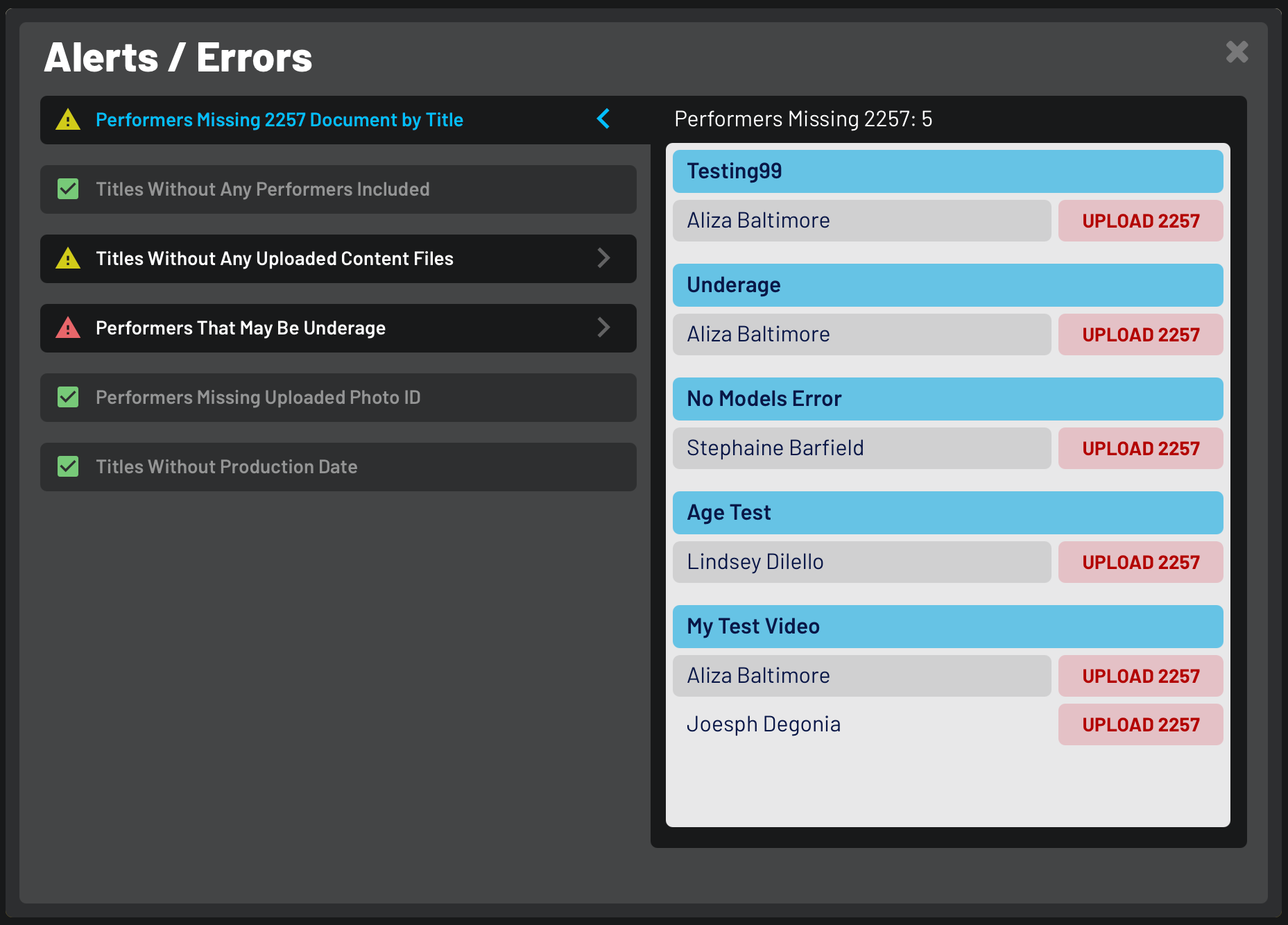 KEY NEW FEATURE: The 2257Snap Dashboard now performs smart self-audits to find any potential problems with your records. The Dashboard will alert you to potential errors or missing information, and show you exactly where those issues exist.
