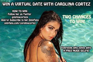 Entering is easy, just follow Carolina on Twitter and/or OnlyFans. Take a screenshot of one or both and send it to winadatewithcarolinacortez@gmail.com. She will email you back a naked selfie for each entry with the chance to get up to two exclusive naked selfies. Of course, if you already follow Carolina on Twitter and/or are an OnlyFans subscriber, you can get rewarded too using the same process.