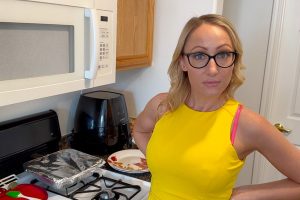 On the big day, Crystal is cooking up a marvelous Thanksgiving feast. As she bends over to baste the turkey, Sam begins to feel his pants tighten. He tells Crystal that he’d like to stuff her. She hesitates at first because his dad will be home in 40 minutes, but she realizes that’s plenty of time to get stuffed. They fuck in several positions, with Sam covering her torso with his whipped cream.