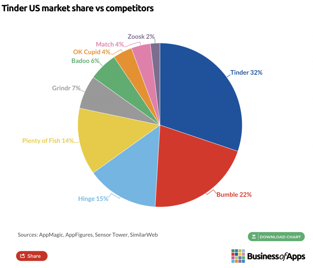 Currently, the site that invented the swipe has 75 million active users with 6.2 million subscribers and controls 32% of the dating app pie in the United States, as reported on by Business of Apps. Bumble and Hinge trail behind at 22% and 15% respectively but both are growing fast and could give Tinder a run for the money in the years to come. This is evidenced by the fact that Bumble’s monthly usage grew a whopping 96% between January 2019-2022 while Hinge quadrupled its audience usage in that same period.