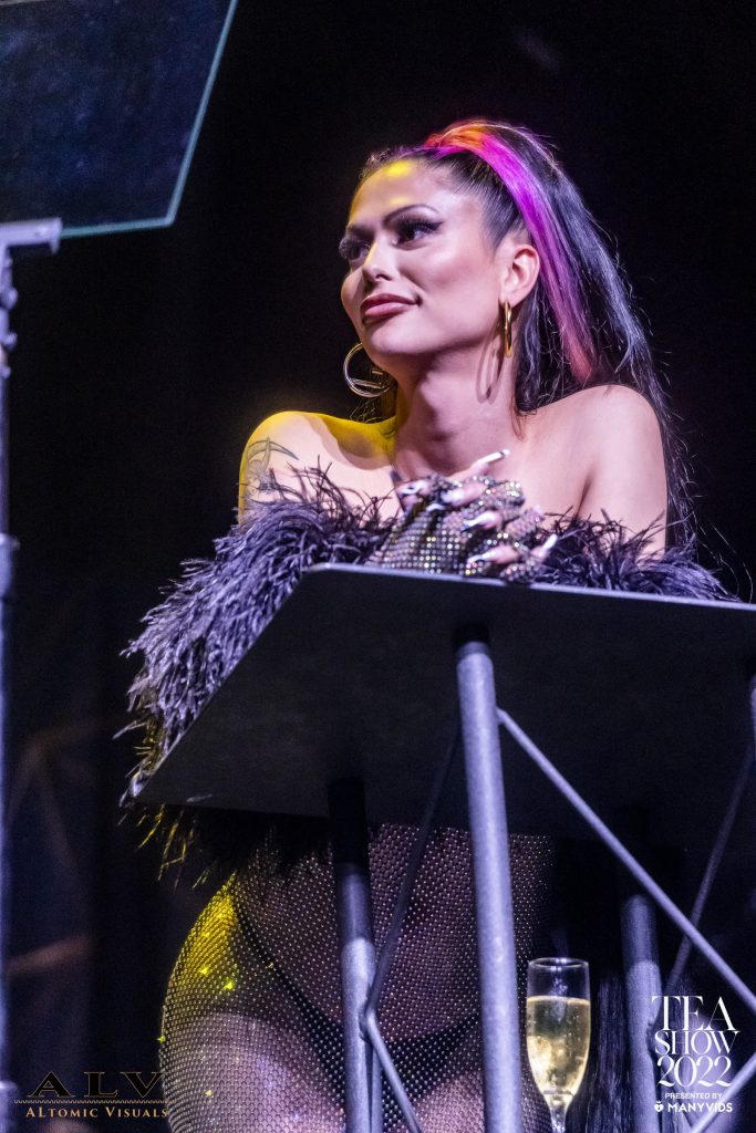 The 2022 TEAs presented by ManyVids took place on March 13, 2022, at the historic Avalon in Hollywood, CA. Red carpet host Natassia Dreams kicked off the event by interviewing guests in front of a dazzling outdoor media wall in front of the venue, followed by a mesmerizing opening performance by trans artist and popstar, Alissah, with a surprise appearance by Domino Presley in Alissah’s latest song, “Daddy.” Presley then returned to the stage to assume her role as the TEA Mistress of Ceremonies.