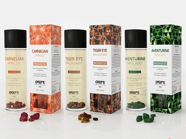 PARIS – Exsens has added three new products to its Crystal Massage Oil collection. Tiger Eye is blended with the essence of macadamia nuts, Aventurine offers the benefits of avocado and Carnelian conveys the tart sweetness of apricots. The three join Amethyst (sweet almond), Amber (jojoba) and Garnet (argan) in the holistic body care line.