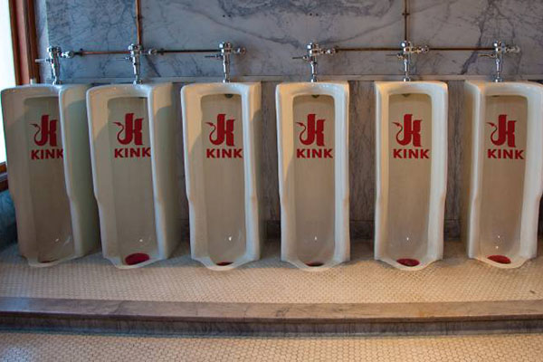 Kink’s designers had created backdrops of their Hogtied room, Ultimate Surrender wrestling ring, a padded cell, a bondage wall and a bank of branded urinals, among others.