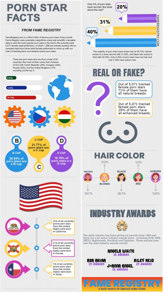 Fame Registry is a Who’s Who of top industry talent. Every month, the site uses proprietary algorithms and traceable data to rank the most popular porn stars in the world. Their database currently includes 5,071 women stars — and they’ve used that information to highlight some interesting facts.
