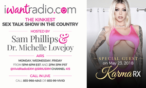 LOS ANGELES, CA – Adult sensation Karma RX will be a guest on iWantEmpire’s new erotic talk show, iWantRadio.com from 2 to 3 p.m. on Wednesday, May 23. The broadcast, hosted by Dr. Michelle Lovejoy and special guest host Sam Phillips, airs on SiriusXM Channel 415.