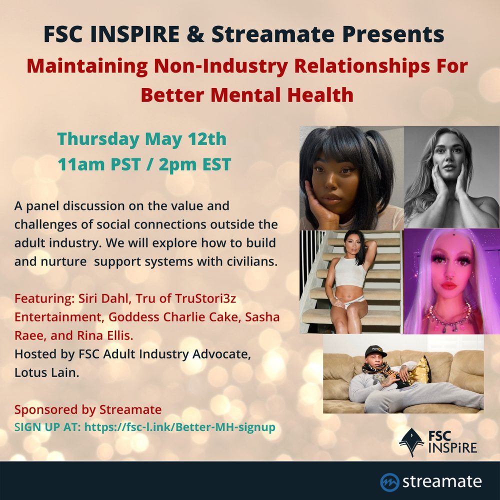 As part of Mental Health Awareness Month, the Free Speech Coalition (FSC) and Streamate are partnering on a special webinar for adult content creators. The webinar will address the value and challenges of social connections outside the adult industry.