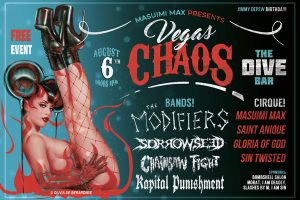 Vegas Chaos is happening at the Dive Bar in Las Vegas on Saturday night, with the doors opening at 8pm. The 21+ event is free to attend, and early arrival is suggested since it will be a standing-room-only event. The Dive Bar is located at 4110 S. Maryland Pkwy in Las Vegas. More info about the show can be found at Reverb Nation..