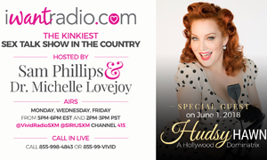 “Hudsy is a multifaceted talent who is not just a dominatrix, but also a media personality, writer and sex educator all rolled into one,” said Lovejoy. “She has great passion for her work and a deep desire to educate and entertain at the same time. We are very pleased to welcome her to iWantRadio!”