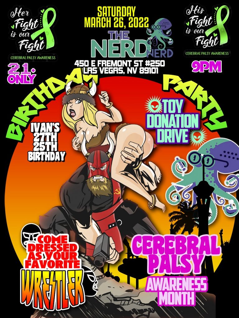 “March is Cerebral Palsy Awareness Month, which made it a perfect opportunity to shed light on such an important cause. Thank you to The Nerd Bar for allowing us to spread out donation drives to Las Vegas this year. I can’t wait to see people dress us as their favorite wrestler and donate toys!” Ivan added.