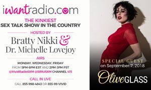 iWantRadio is dedicated to creating an open dialogue about human sexuality, fetish, and evolution, toward acceptance and celebration of consensual sex. iWantRadio.com airs every Monday, Wednesday, and Friday on SiriusXM Channel 415 from 2-3pm PT/5-6pm ET. Listeners can call in by dialing 1-855-99-VIVID or (855) 998-4843. More information as well as a schedule of upcoming guests is available at iWantRadio.com. To be a guest, sponsor or to suggest a topic, send us an email.