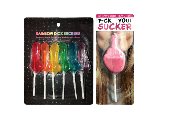 Rainbow Dick Suckers is a set of six penis-shaped suckers, each with a different flavor. Flavors are: strawberry, orange, banana, lime, blue raspberry, and grape. They are perfect for pride celebrations, bride-to-be and other adult parties; as each guest can select their own favorite flavor of sucker. Each sucker is 20 grams (.071 oz.) and 30 calories.