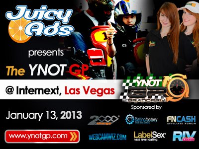 Sponsors of the Las Vegas event include JuicyAds, Dating Factory, 2000Charge, FNCash, RIVCash, WebcamWiz and LabelSex. To secure a seat as a driver or to investigate sponsorship opportunities, visit YNOTgp.com, email LAJ or ping ICQ 92418228.