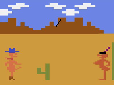 The most notorious of Mystique’s X-rated Atari games was Custer’s Revenge, also known as Westward Ho and The White Man Came. Again using Atari’s side-to-side motion [à la Pong] in 2D, Custer purports to represent a naked and apparently erect infamous military figure attempting to sexually skewer an equally naked native woman — while trying to dodge black lines that may be arrows, bullets … or just black lines.