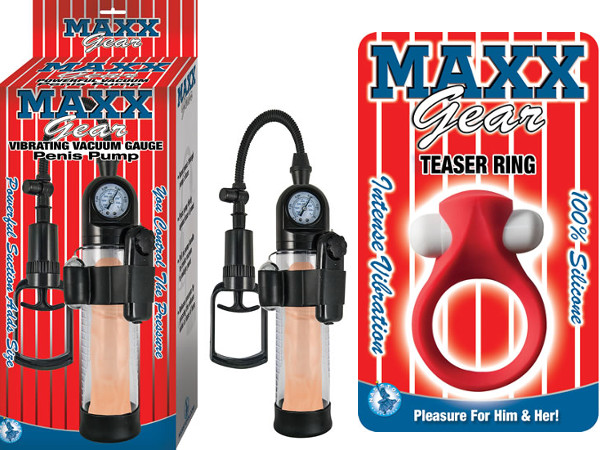 Other items in the collection include the Maxx Gear Vibrating Gauge Penis Pump, the Maxx Gear Powerful Vacuum Penis Pump, the Maxx Gear Pleasure Ring, the Maxx Gear Teaser Ring, the Maxx Gear Stimulation Ring and the Maxx Gear Mr. Big.