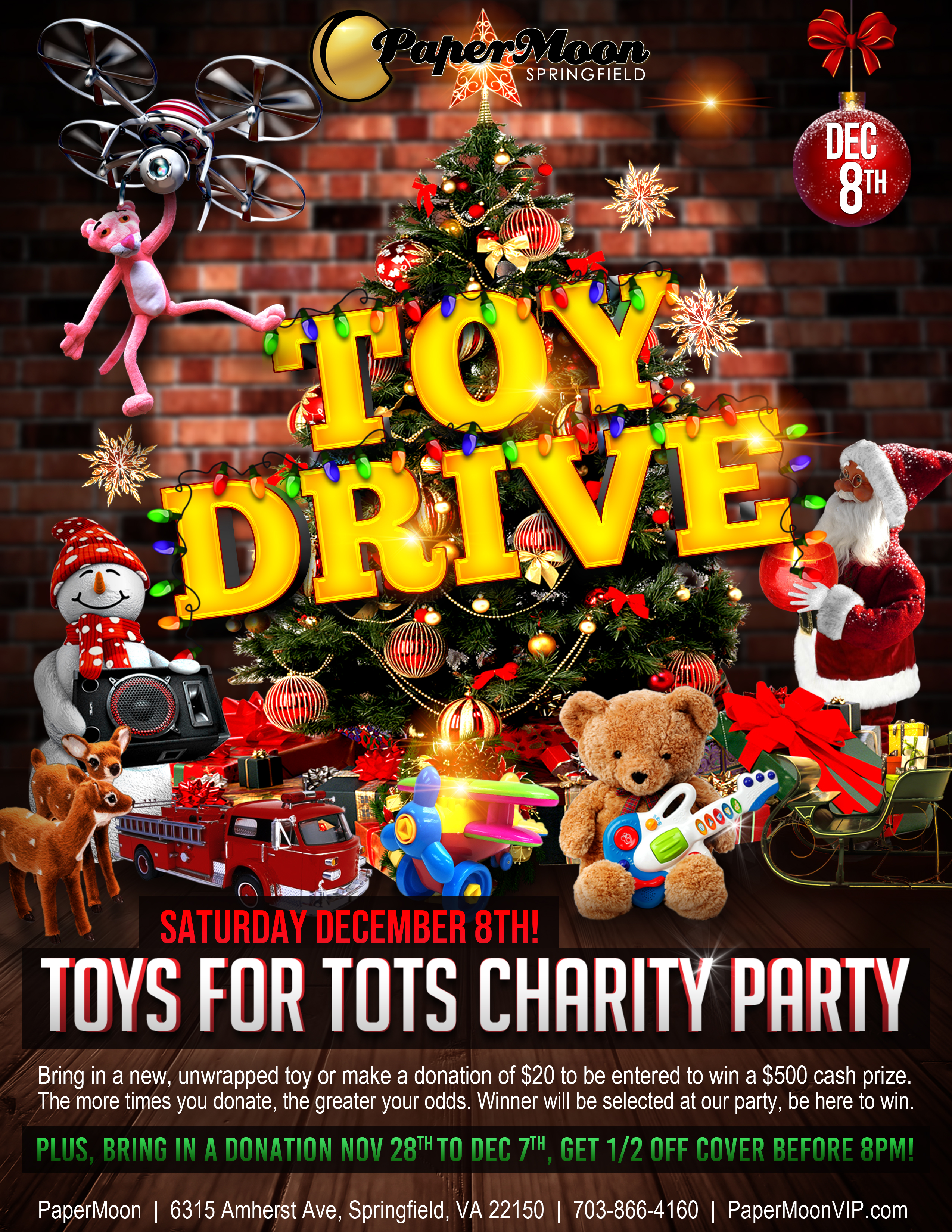 Customers can bring in a new unwrapped toy or make a donation of $20 or more to be entered to win a $500 cash prize. The more donations a customer provides, the greater that customer’s odds of winning. Winners will be selected at the party and must be present to win.