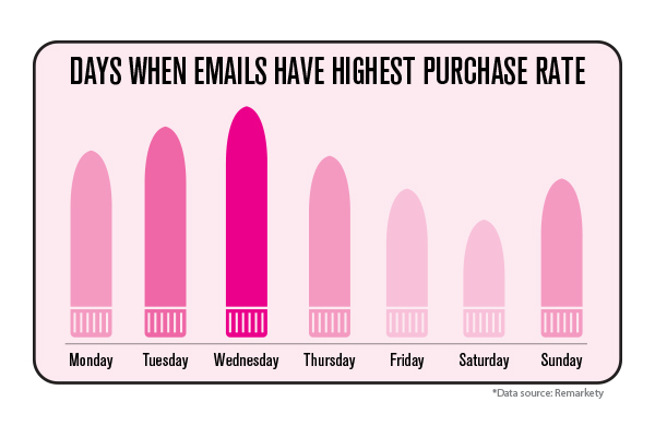They included two cute graphics to drive their point home. One shows Wednesday emails having the highest purchase rate. The other breaks down variable purchase rates on the basis of times of day. One assumes this data is applicable to each day of the week, not just Wednesdays.