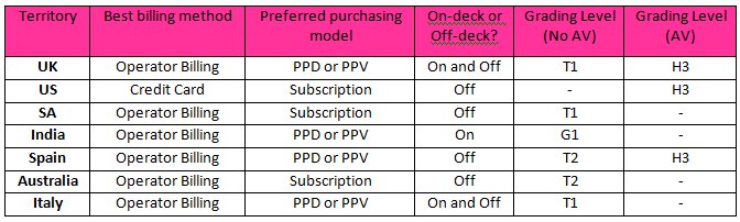 As a quick initial guide, below is a chart of current “best-performing” business models (although other models are available) in the leading adult mobile territories: