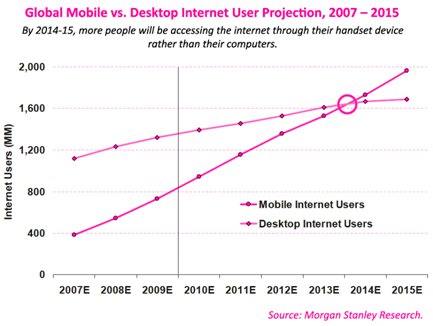 If you’re not already thinking about mobilizing your current services, then take a look at this chart from Morgan Stanley, which predicts that as early as 2014-2015, more people will access web sites via their mobile handsets than via computers.