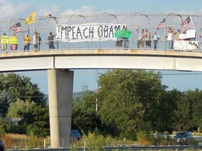 The local Tea Party retaliated by returning to the overpass, wearing t-shirts that collectively spelled out “Impeach Obama.” The police kicked them off.