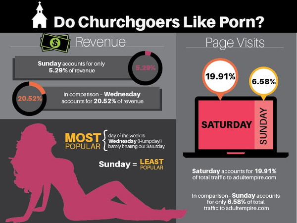 “We don’t know if our customers are taking the day of rest literally or if they’re spending more time in church, but without a doubt, we get the least action on Sunday,” said Adult Empire’s director of marketing, Megan Wozniak. “We do well on Wednesday and Saturday, it gets quiet on Sunday, and then it’s back to big business on Monday.”