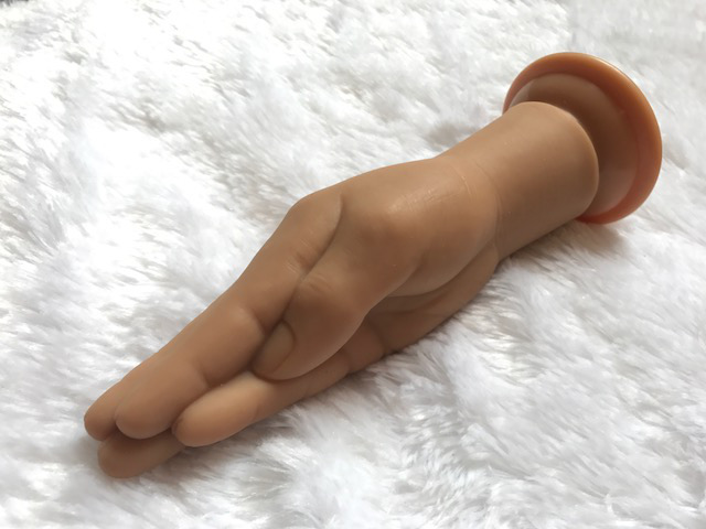 Measuring 7.5 inches from base to tip, 6.5 inches of the hand are insertable before giving way to the “wrist” and a flared base. It’s 2.5 inches at its widest point, so it’s not too overwhelming. The base is flat, and can suction itself to any flat surface, allowing for solo and/or hands-free play.