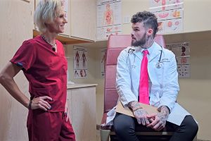 The scene opens with Dr. Gurius and Nurse Bentley in an exam room discussing Nurse Bentley’s ongoing issue of recurring erections, often termed “hard-ons” and/or “boners” in modern medical jargon. What begins as a professional consultation swiftly transitions into an unconventional treatment plan when Gurius goes in for a closer look at Ria’s problem by giving the pretty nurse a blow job.