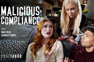 Scarlett Skies has made her Pure Taboo debut in “Malicious Compliance” as Rachael. She and her stepbrother Troy (Max Fills) are always fighting and have been suspended from school. Actions have consequences, and stepmom Cathleen (Serene Siren) is angry she had to leave work to deal with this. She’s installed security cameras everywhere, and they’re grounded. Rachael and Troy brainstorm how they will “get along” in a twisted way and decide to use the security cameras to get back at their stepmom. They have sex, and once Cathleen checks the feed from work, she’s livid to see the stepsiblings fucking. Watch the extended trailer and scene at Pure Taboo.
