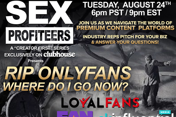 SEX PROFITEERS will hold a discussion panel featuring representatives from various premium content platform companies looking to fill the void that OnlyFans leaves behind in the wake of their announcement banning sexually explicit content as of October 1, 2021. Industry veterans and co-founders of boutique marketing firm Agency Bardo, Magalie Rheault COO of Evil Angel & Cyndi Pham CEO of Dirty Hen to will be moderating the event on their weekly show airing on Tuesday August 24, 2021 at 6:00pm PST / 9:00pm EST exclusively on Clubhouse.