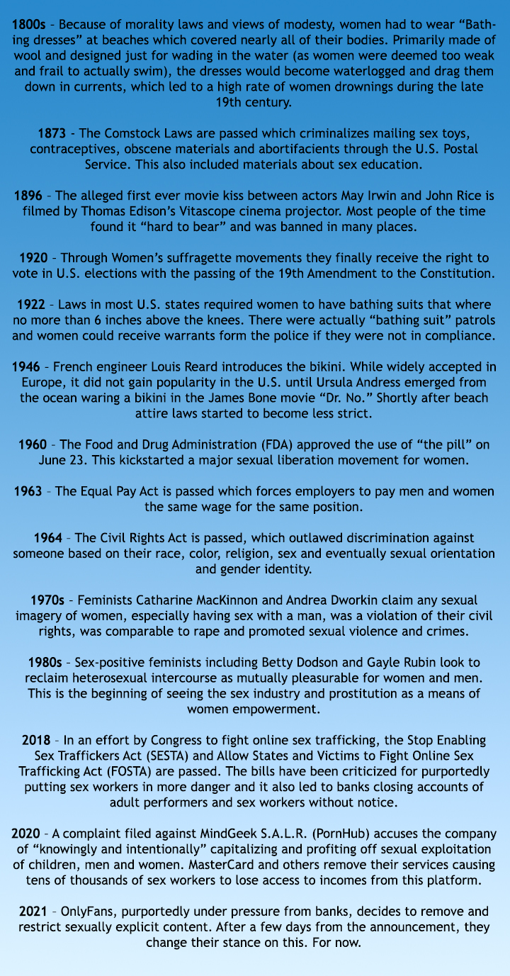 Here is a short chronology and explanation of major moments in history dealing with sex worker and women’s rights, restrictions and discriminations: