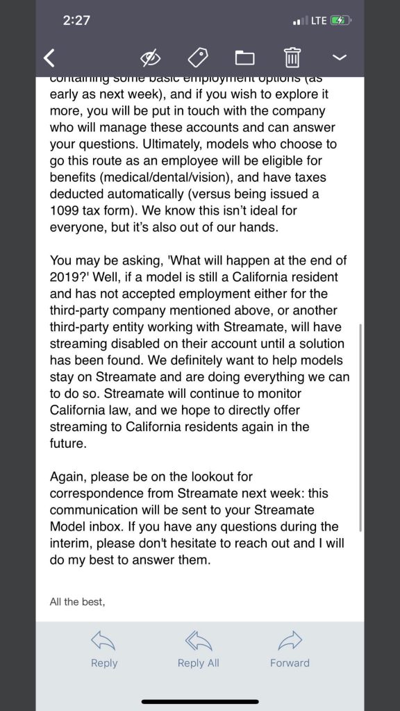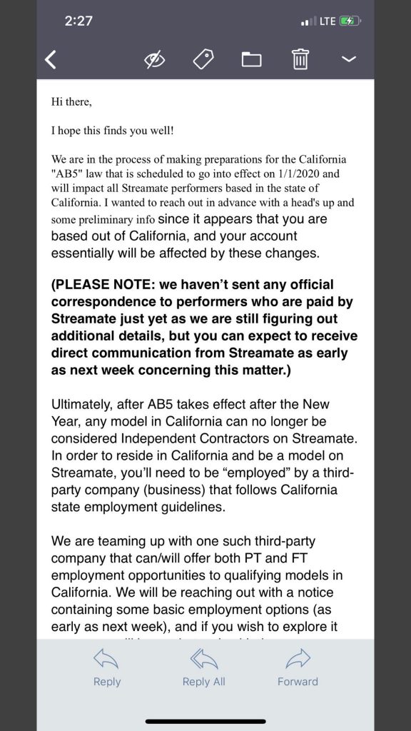 A representative at Streamate issued the following email yesterday to select models, on December 5, 2019. Its content concerns California’s AB5.