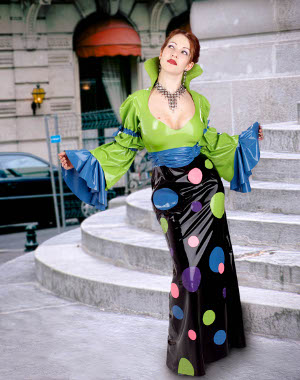 The Baroness has been a designer of elegant, provocative latex fashions since 1994. She is renowned for her fashion events, parties and performances. The Baroness has been a spokesperson for latex fashion in the media, including on HBO’s Real Sex, A&E and the Playboy Channel. Her shop of latex wear and rubber gear is located at 530-B East 13th Street in New York City. Orders and inquiries may be placed online or by calling 212-529-5964.