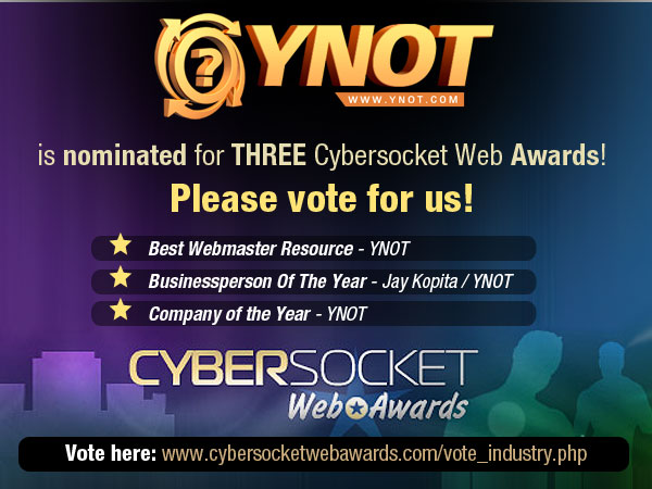 (In the interest of full disclosure, YNOT is nominated in two Industry Choice categories: Best Webmaster Resource and Company of the Year. YNOT co-owner Jay Kopita is among the nominees for Businessperson of the Year.)
