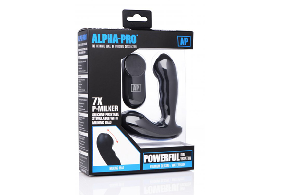 The Alpha-Pro 7X P-MILKER Silicone Prostate Stimulator with Milking Bead features a bead beneath the surface of the tip that moves up and down, pleasurably milking the prostate while an independent exterior motor puts textured pressure on the perineum. This unit can be used with or without the remote control to cycle through seven vibration, pulsing, and throbbing settings.