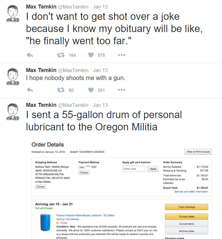 “We sell a lot of lube, but this might be our most memorable transaction to date,” Weinberg said of Temkin’s thoughtful gift. “A 55-gallon drum of Passion Lubricants goes a long way, and Temkin was smart to choose our water-based variety. It’s compatible with all of the lovely dildos and dongs the Oregon militiamen have received and will assure a slick and smooth experience for all involved.”