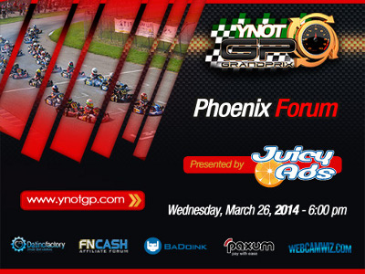TEMPE, Ariz. – The YNOT Grand Prix’s fifth championship season will make its second pit stop March 26 as an official opening event for the annual Phoenix Forum conference. Set to begin at 6 p.m. at a new facility in Scottsdale, Ariz., the race is presented by long-term title sponsor JuicyAds.